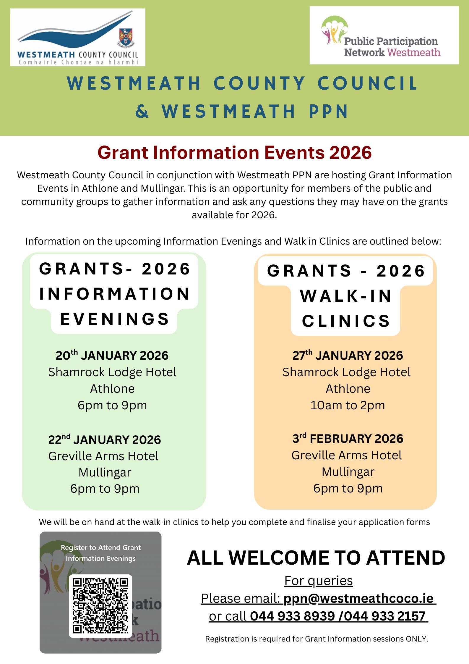 Westmeath Public Participation Network and Westmeath County Council are hosting Grant Information Evenings and Walk in Clinics in late January and early February, both in Athlone and Mullingar.